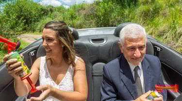 La llegada de la novia fue anunciada por cornetas que la misma novia y su papá hacían sonar desde el auto que los trasladaba. A partir de ese detalle uno puede imaginarse el ambiete que reinó hasta el final de la fiesta.
